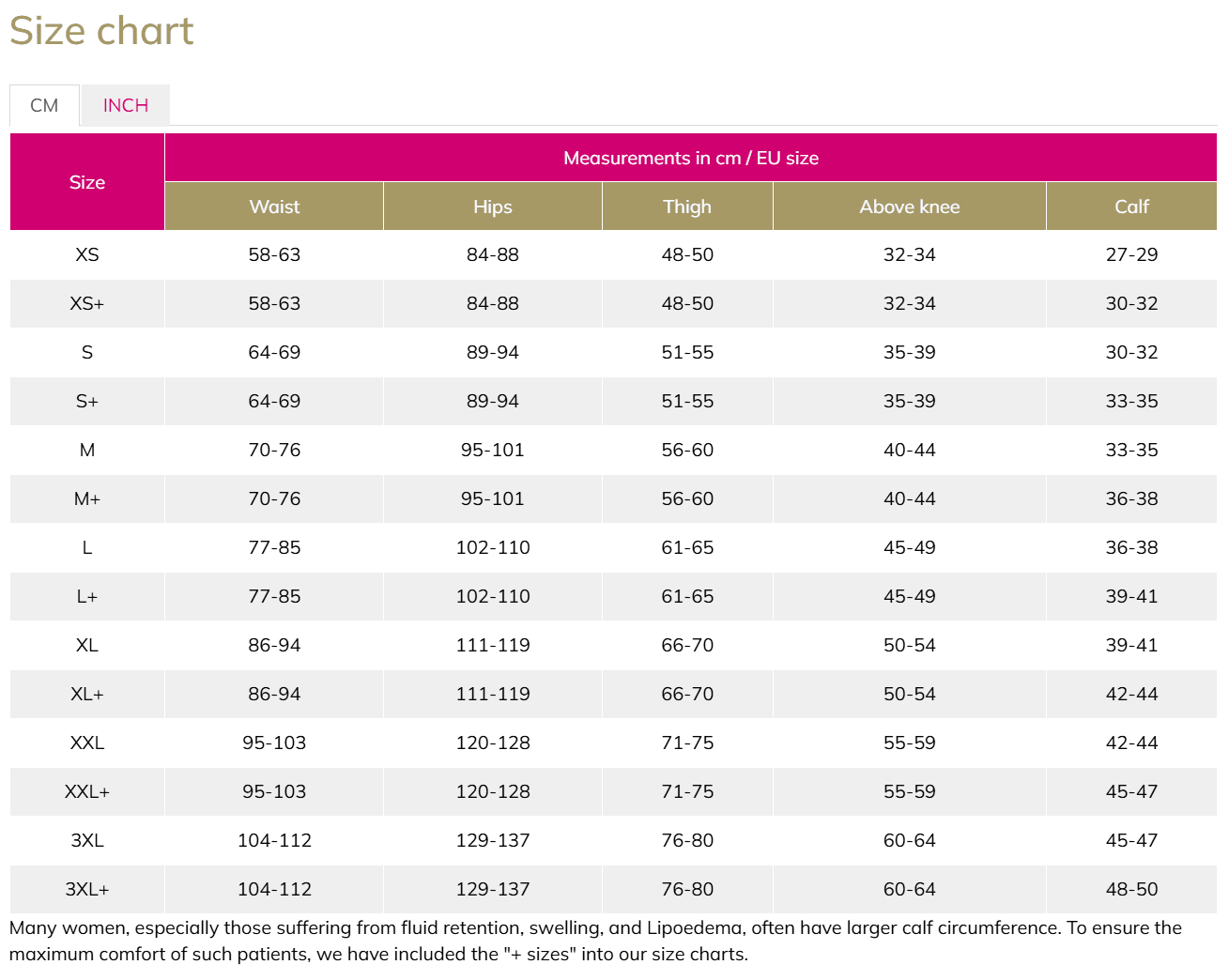 Many people with Lipoedema or swelling have fuller calves. LIPOELASTIC® leggings include extra calf room in selected sizes — look for the “+” options on the size chart.